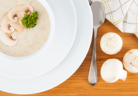 白い木製の板にマッシュルームのシャンピニオンクリームスープ上からの眺めテキスト用のスペース キッチンのストックフォトや画像を多数ご用意 Istock