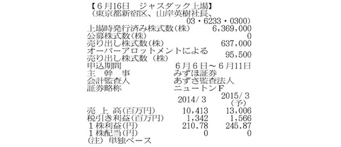 6月ipo第1号 ニュートンfcは初値3065円と公開価格割れ 会社四季報オンライン 日本最強の株式投資情報サイト